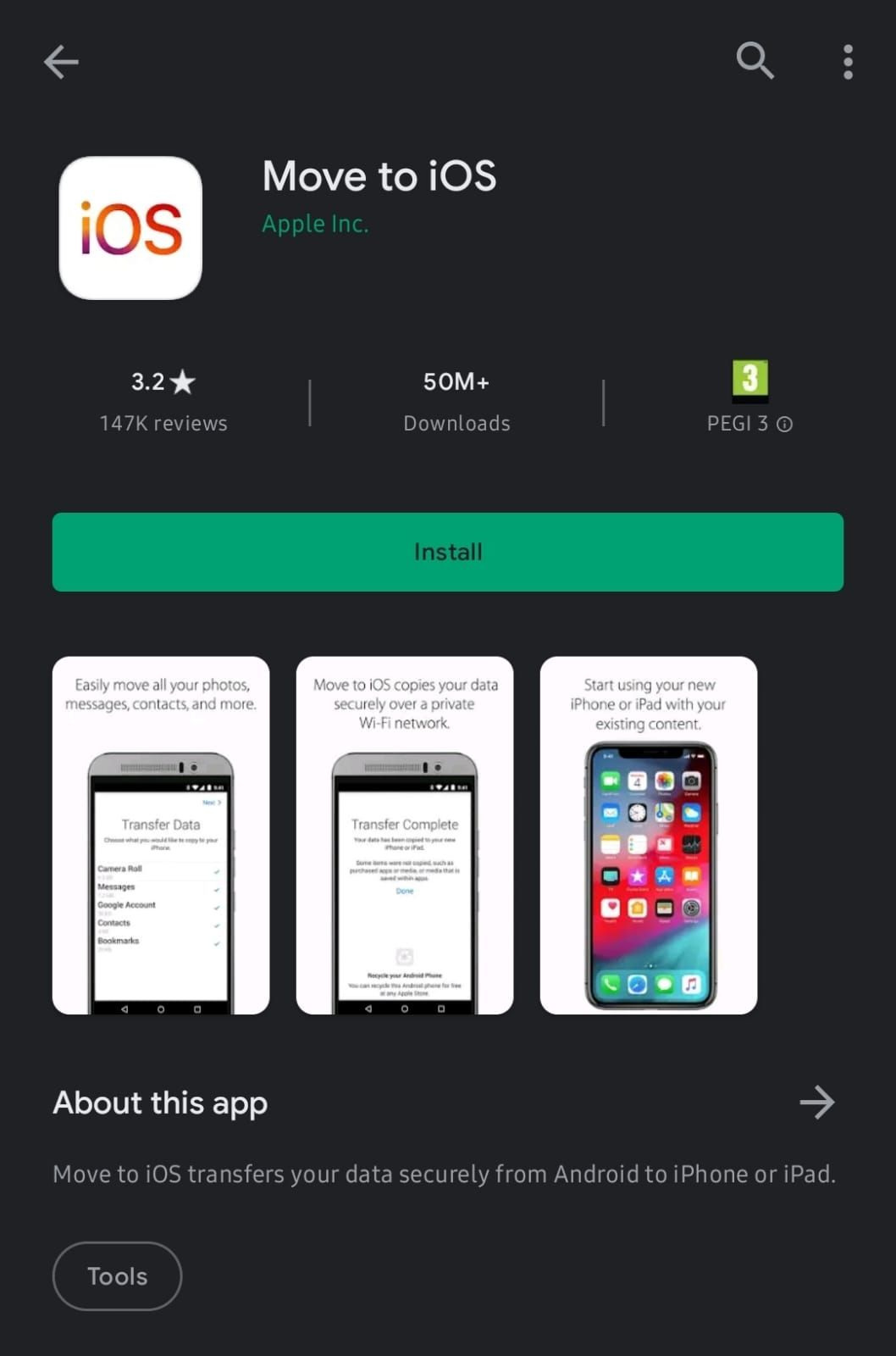 Отидете в Google Play и изтеглете приложението Move to iOS, което ще ви помогне да прехвърляте данни между Android и iPhone.